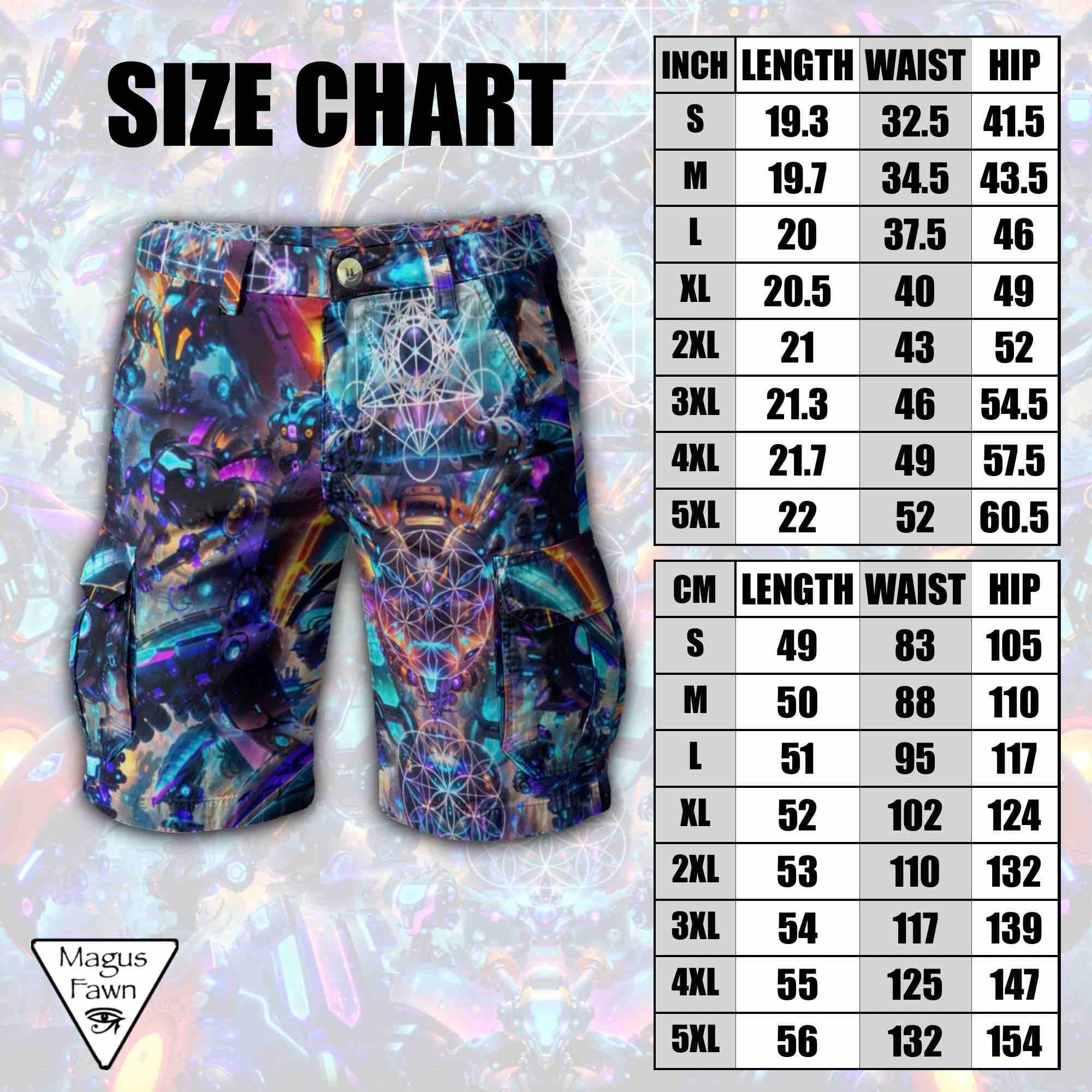 Designed for comfort and everyday versatility, these men’s cargo shorts are made from a durable, breathable denim-like fabric that offers a relaxed feel with a classic, casual look. Featuring a trippy psychedelic art print with a sturdy button-closure waistband and multiple cargo pockets for easy storage, they balance function and style effortlessly. The comfortable fit allows for all-day movement, making these shorts perfect for festivals, rave shorts for men and ready for wherever the journey takes you.